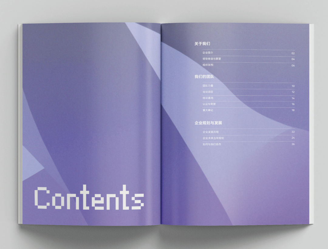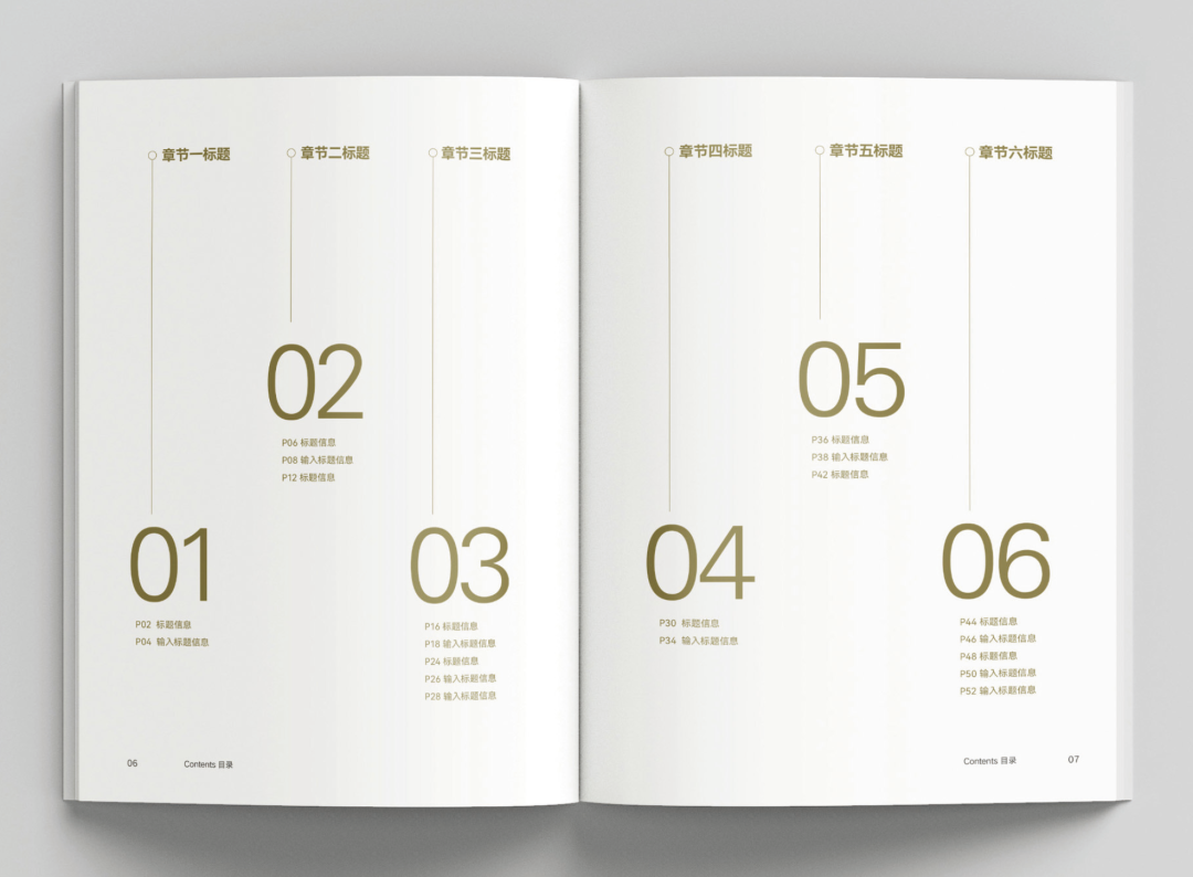 如果畫冊包含大量內(nèi)容,提供目錄能起到檢索和預覽畫冊內(nèi)容的功能,有助于讀者快速定位到感興趣的內(nèi)容。目錄一般被安排在扉頁之后。目錄的設(shè)計應(yīng)當清晰明了、簡潔大氣,并具備正確的視覺引導流程。以下是目錄頁設(shè)計的主要編排形式。