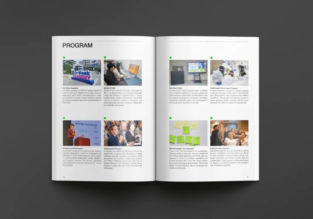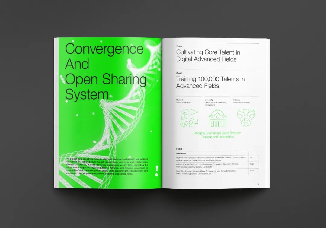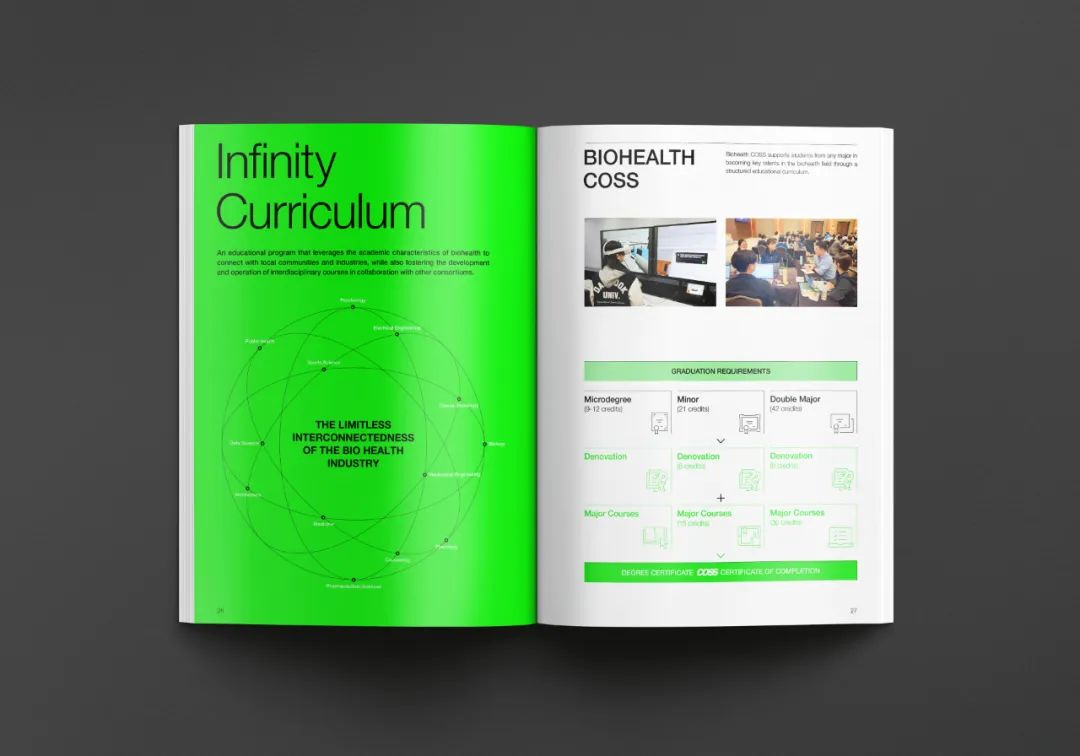生物健康創(chuàng)新融合大學是通過大學間的融合、開放與合作,旨在國家層面上培養(yǎng)生物健康、人工智能等尖端領(lǐng)域人才的項目。Design Purple 制作了介紹 COSS 圖形開發(fā)及項目特點與課程的英文宣傳冊。