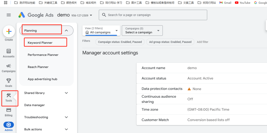 成功進入 Google Ads 賬號頁面后,依次點擊 “Tools (工具)--->Planning(規劃)--->Keyword Planner(關鍵詞規劃師)”,即可順利開啟關鍵詞研究之旅。