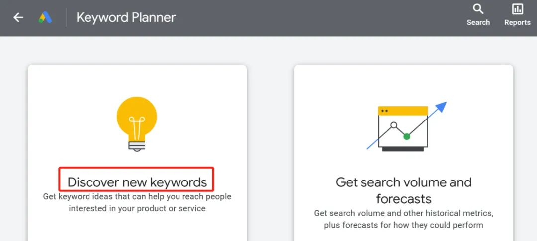 在谷歌關鍵詞規劃師頁面,找到并點擊 “Discover new keywords 發現新關鍵字” 按鈕。