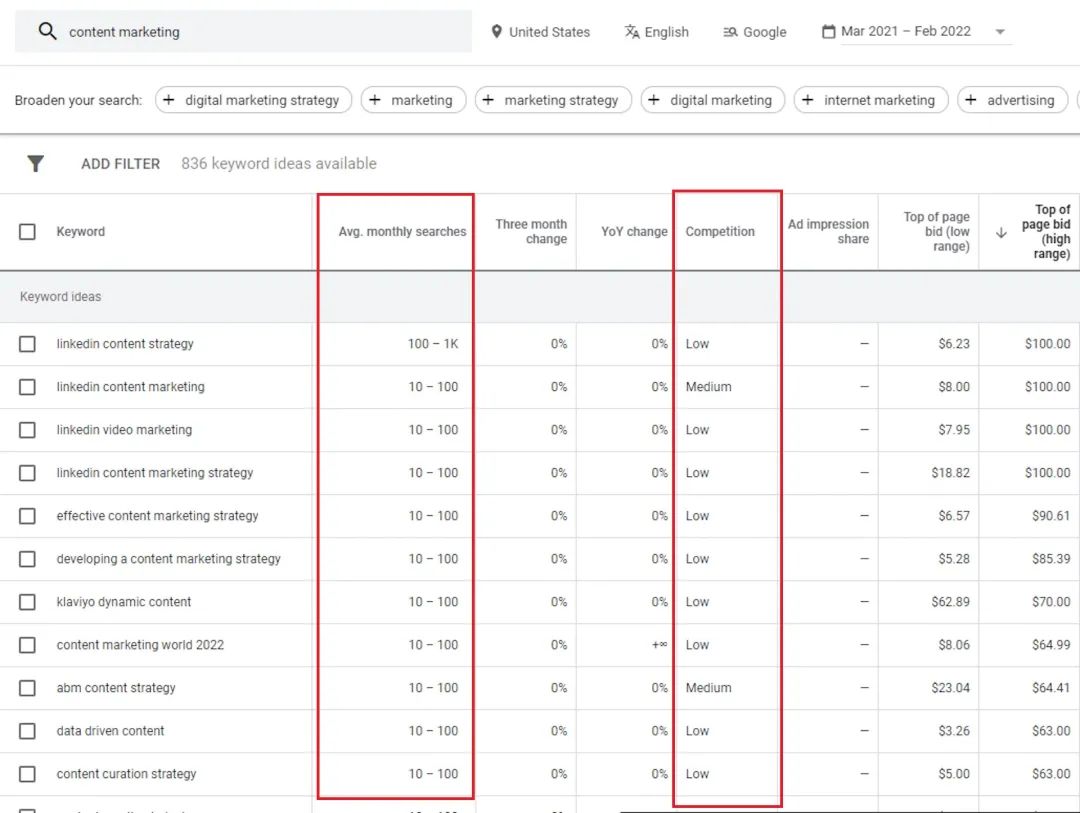 隨后,點(diǎn)擊“獲取結(jié)果”,你將看到每個(gè)關(guān)鍵字的“平均每月搜索量”,這可以幫助你了解它們的搜索頻率。同時(shí),關(guān)注競(jìng)爭(zhēng)程度,它會(huì)顯示為“低”、“中”或“高”。