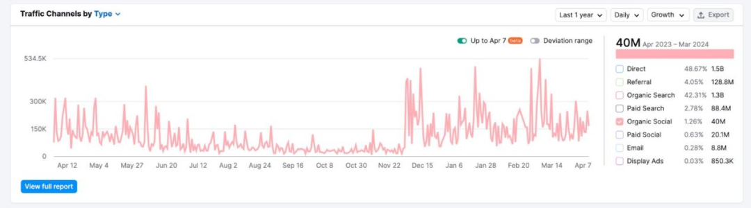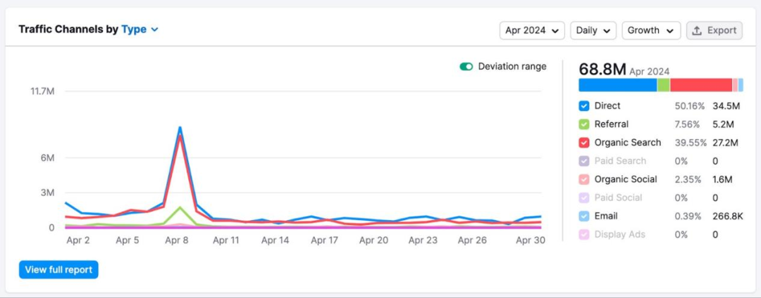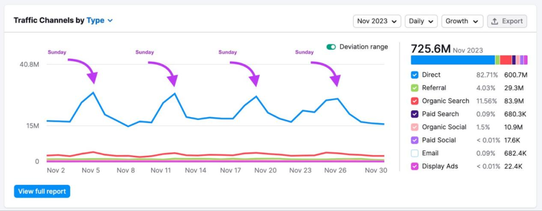 查看Traffic Channels by Type圖表,分析競(jìng)爭(zhēng)對(duì)手流量波動(dòng)的原因。流量飆升可能意味著他們意識(shí)到并抓住了市場(chǎng)機(jī)會(huì),而流量急劇下降可能代表他們的決策出現(xiàn)失誤,或者競(jìng)爭(zhēng)對(duì)手的舉動(dòng)損害了他們的利益。