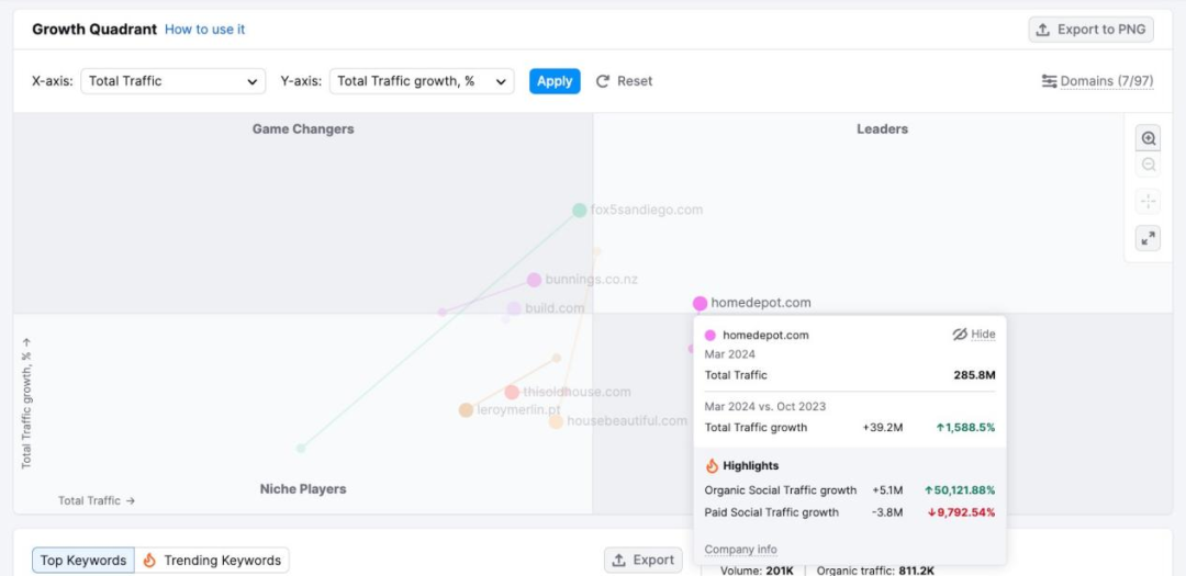 Traffic Analytics中查看流量來(lái)源圖表,觀察自然搜索流量的增長(zhǎng)趨勢(shì)。如果不是一次性的激增,而是有規(guī)律的增長(zhǎng),說(shuō)明homedepot.com在這一渠道上實(shí)施的策略是長(zhǎng)期有效的。