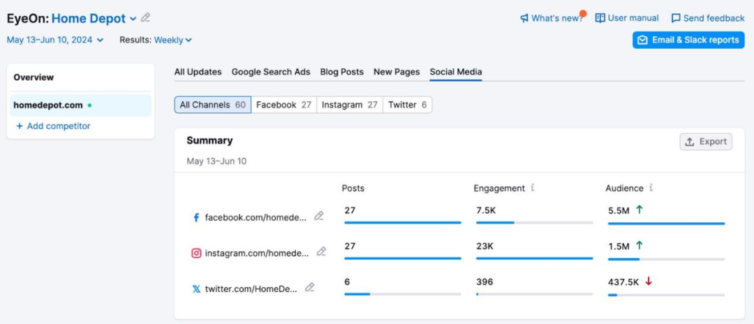 Homedepot.com 的自然社媒策略舉例,EyeOn能夠跟蹤他們的社交媒體活躍度以及與受眾的互動(dòng)表現(xiàn),你可以清楚的看到他們發(fā)布了什么內(nèi)容以及跟受眾互動(dòng)的情況。