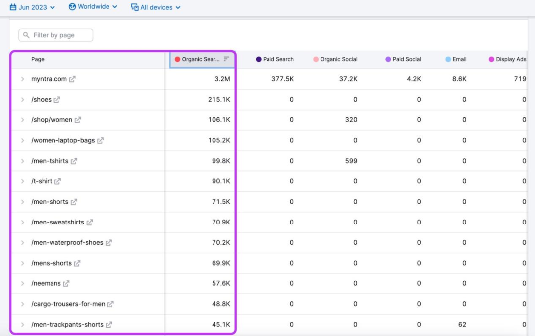 確定競(jìng)爭(zhēng)對(duì)手的主要流量渠道后,前往Traffic Analytics,獲取Top Pages report,了解哪類內(nèi)容、促銷或產(chǎn)品頁(yè)面的市場(chǎng)參與度最高。