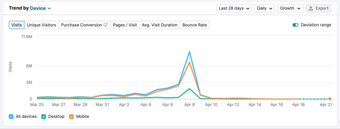 用流量趨勢(shì)圖觀察競(jìng)爭(zhēng)對(duì)手過(guò)去一年的流量趨勢(shì),可以發(fā)現(xiàn)市場(chǎng)中的特殊事件。如果你知道某個(gè)事件即將發(fā)生,那么跟蹤日常流量,了解其變化趨勢(shì)。
