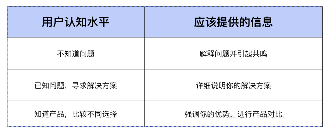不同用戶對你的產品有不同的了解程度。在設計著陸頁時,你需要判斷大多數訪客的認知水平,并根據其需求提供不同層次的信息。