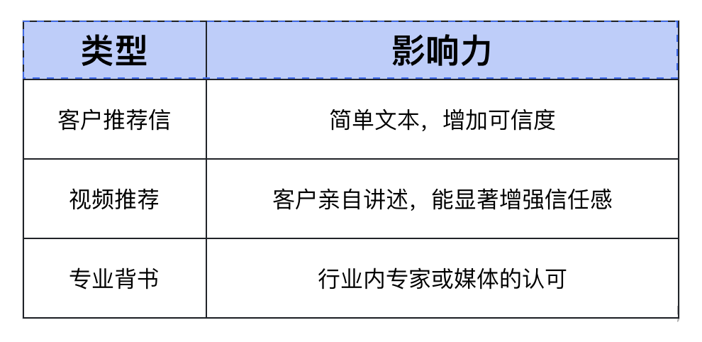例如,視頻推薦信通常比文字評(píng)價(jià)更有說(shuō)服力,尤其是客戶(hù)親自展示使用過(guò)程和效果時(shí),可信度大大增加。