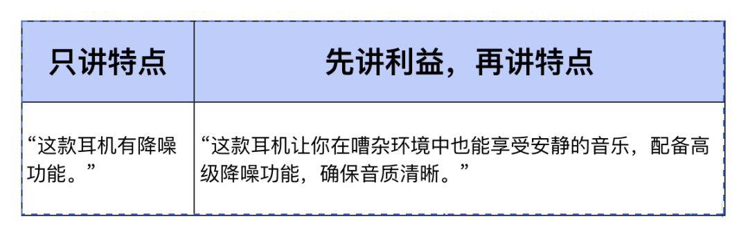在這個(gè)示例中,通過(guò)先描述耳機(jī)帶來(lái)的“安靜音樂(lè)體驗(yàn)”,然后再介紹降噪功能,能讓用戶(hù)感受到更大的吸引力。