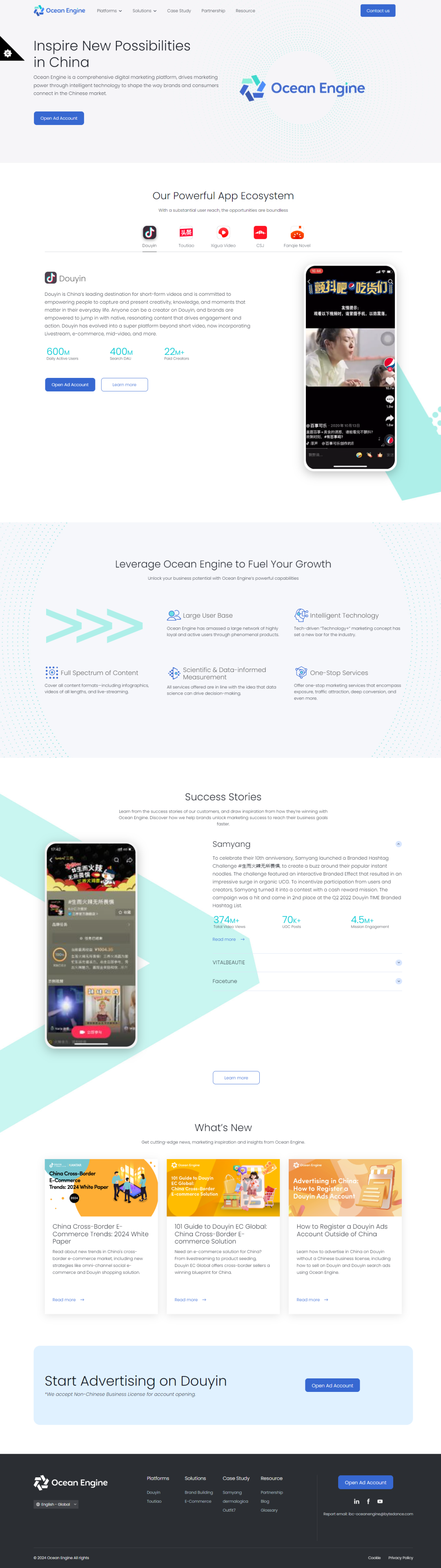 在巨量引擎海外版官網的設計中,我們采用了簡潔明了的導航布局。頂部導航欄清晰地劃分了“產品”、“解決方案”和“案例研究”等主要分類,每個分類下還設有詳細的子選項。這種結構不僅讓用戶一目了然,還能幫助他們快速定位到所需信息,顯著提升了用戶滿意度。此外,我們還巧妙地運用了留白設計。大量的留白讓頁面看起來更加清爽,使重點信息更加突出,進一步優化了用戶的瀏覽體驗。