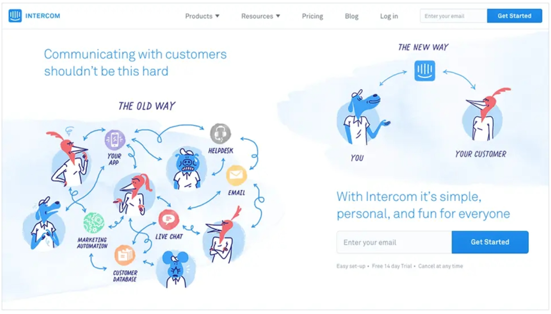 Intercom用生動的手繪風插畫描繪了一副工作中遭遇的混亂場景,引出了使用Intercom可以結束這一切混亂的概念: