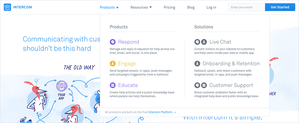 以Intercom為例,它是一款大型CRM應用,公司旗下有三大子產品。官網首頁設置了5個一級導航,其中前兩個是折疊導航。最重要的Products導航的下拉菜單中按照產品和解決方案兩個維度展示了對應的信息。配合icon和簡介,有序又直觀: