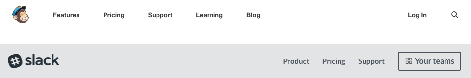 例如企業郵件應用Mailchimp和Slack就是扁平結構的典型代表,它們的導航都只有一級,把所有頁面入口都放在外面,最重要的功能、定價位于前兩個位置,其余的根據重要性遞減排列,最右邊一般會放注冊或登陸入口: