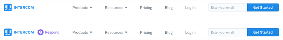 繼續以Intercom為例,首頁導航在滾動時保持常駐。當點擊首頁導航到達子產品頁面后,導航保持一致,只是在原先的主LOGO旁多了一個子產品LOGO來表明當前所在頁面,點擊主LOGO可以返回首頁: