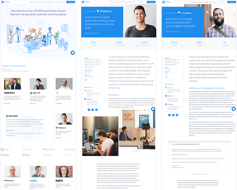 Intercom在客戶故事這方面下足了功夫,每個重點客戶都有內容豐富的專題頁,里面有客戶公司簡介,描述了用Intercom的哪些產品解決了哪些問題,有從他們產品角度出發的第三人稱描述,也有客戶的第一人稱陳述: