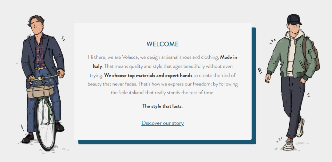 Velasca的網站設計體現了經典的意大利風格,簡潔而不簡單。整體色調偏向中性色,如米色、灰色和黑色,搭配精美的產品攝影,不僅提升了產品的質感,也與品牌的高端定位相契合。特別值得一提的是,首屏下方的手繪卡通板塊,通過生動的卡通形象介紹品牌故事,讓整個網站形象變得年輕而有活力。