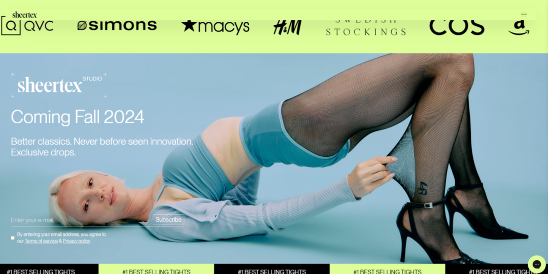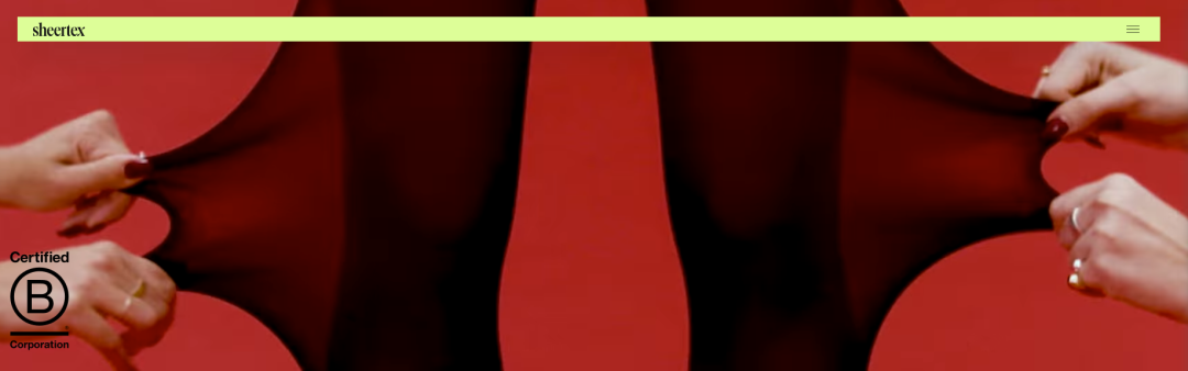 Sheertex的網頁設計以動態視頻為主,粗暴的絲襪拉扯動作極具視覺吸引力,同時也巧妙地展現了產品的賣點。獨立站的整體排版大膽前衛,鮮艷的滾動字幕看似混亂,實則將品牌的折扣信息和時尚理念展現得淋漓盡致,給人一種叛逆而時尚的印象。