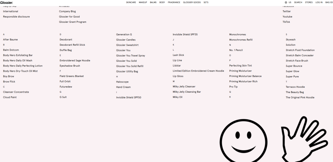 Glossier的網站設計風格簡潔而現代,背景常用白色或淡色調,以突出產品的色彩和細節。這種設計風格完美契合品牌的年輕、時尚和清新形象,同時也反映了其注重簡約美學的品牌理念。特別值得一提的是,高清大圖的局部放大效果極具視覺沖擊力,而底部導航欄按照字母順序排列,讓用戶能夠快速找到所需內容。